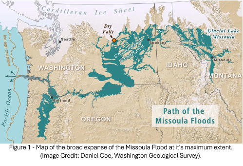 During the latter stages of the ice age, as the earth’s weather began to stabilize, the ice sheets all over the planet began to melt. The melting that occurred in the northwest region of North America produced water flows that filled Lake Missoula, filling many valleys located in the mountains of Western Montana. Lake Missoula was estimated to be 2,000 feet deep near the ice dam located in northern Idaho and was estimated to contain around the same amount of water currently in two of our Great Lakes, Lake Erie and Lake Michigan. When the ice dam broke, it released all that water over a very short period of time, catastrophically shaping the landscape throughout central Washington all the way along the Columbia River out to the ocean.