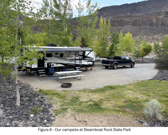 We drove to this area from the south along the Columbia River. There are two paths through the Tri-Cities region — we had already experienced the steep climb and windy stretch heading north on Route 82 and wanted to find an alternate route. We found a gorgeous drive along Routes 730 and 12, both following the Columbia River into the Tri-Cities — highly recommended if you’re traveling with an RV! From there we headed north via US-395 to SR-17, which brought us all the way to Steamboat Rock State Park where we camped for a few days.